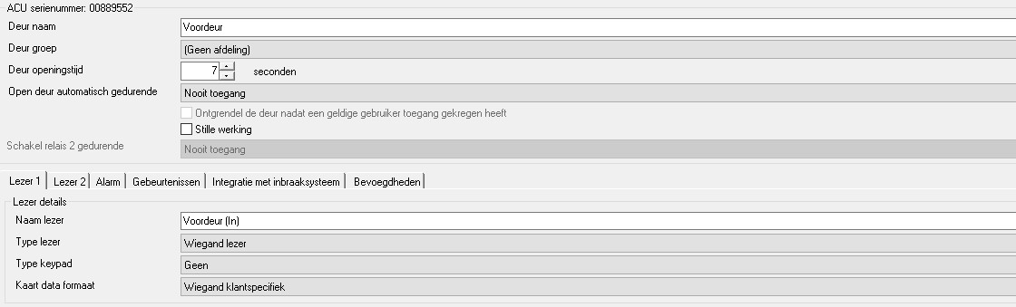 Open de Net2 software om de deur in te stellen op wiegand. Open in Net2 de deurcontroller en configureer de lezer instellingen stel deze in op type lezer Wiegand lezer en het kaart data formaat op Wiegand klantspeciek. Selecteer de lezer werkingsmode Enkel kaart.