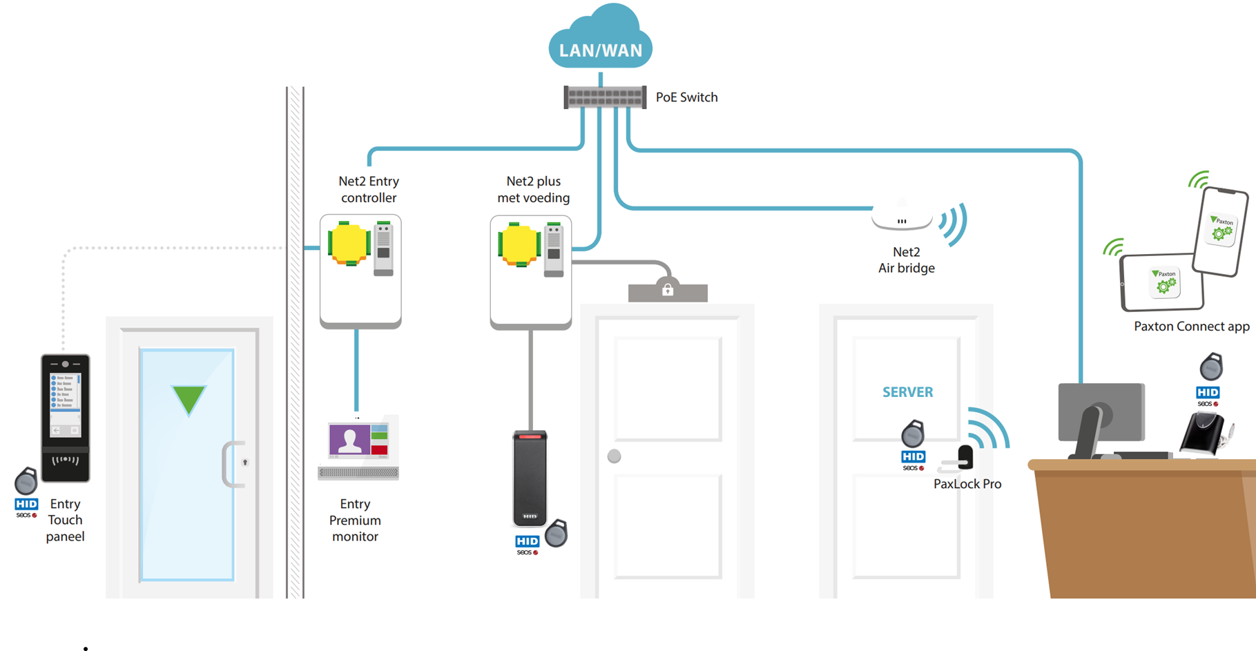 Hoe ziet de systeemopbouw er dan precies uit? Zie het onderstaande overzicht hoe de systeemopbouw er bijvoorbeeld uit kan zien als u HID SEOS lezers toepast, maar ook gebruikt wilt maken van Net2 Multiformat kaartlezers of PaxLock Pro deurbeslagen.