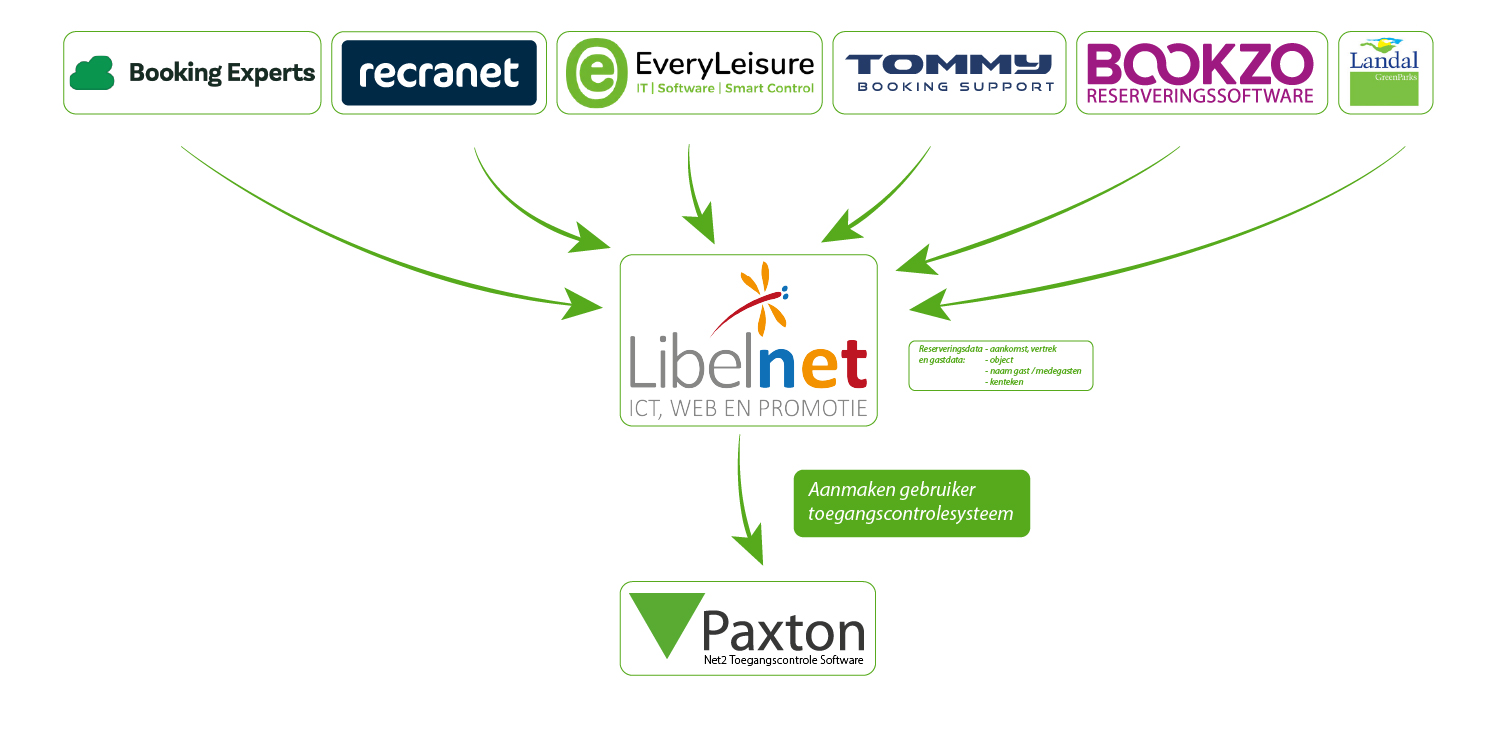 Aangaande toegangscontrole haalt Libelnet automatisch de relevante reserverings- en gastdata op uit het betreffende PMS en maakt daarmee een gebruiker met de juiste toegangstokens aan in het Paxton Net2 toegangscontrole systeem. Dit kunnen toegangstokens zijn op basis van kenteken, pincode, digitale sleutel maar ook op basis van QR-code voor bijvoorbeeld het zwembad.