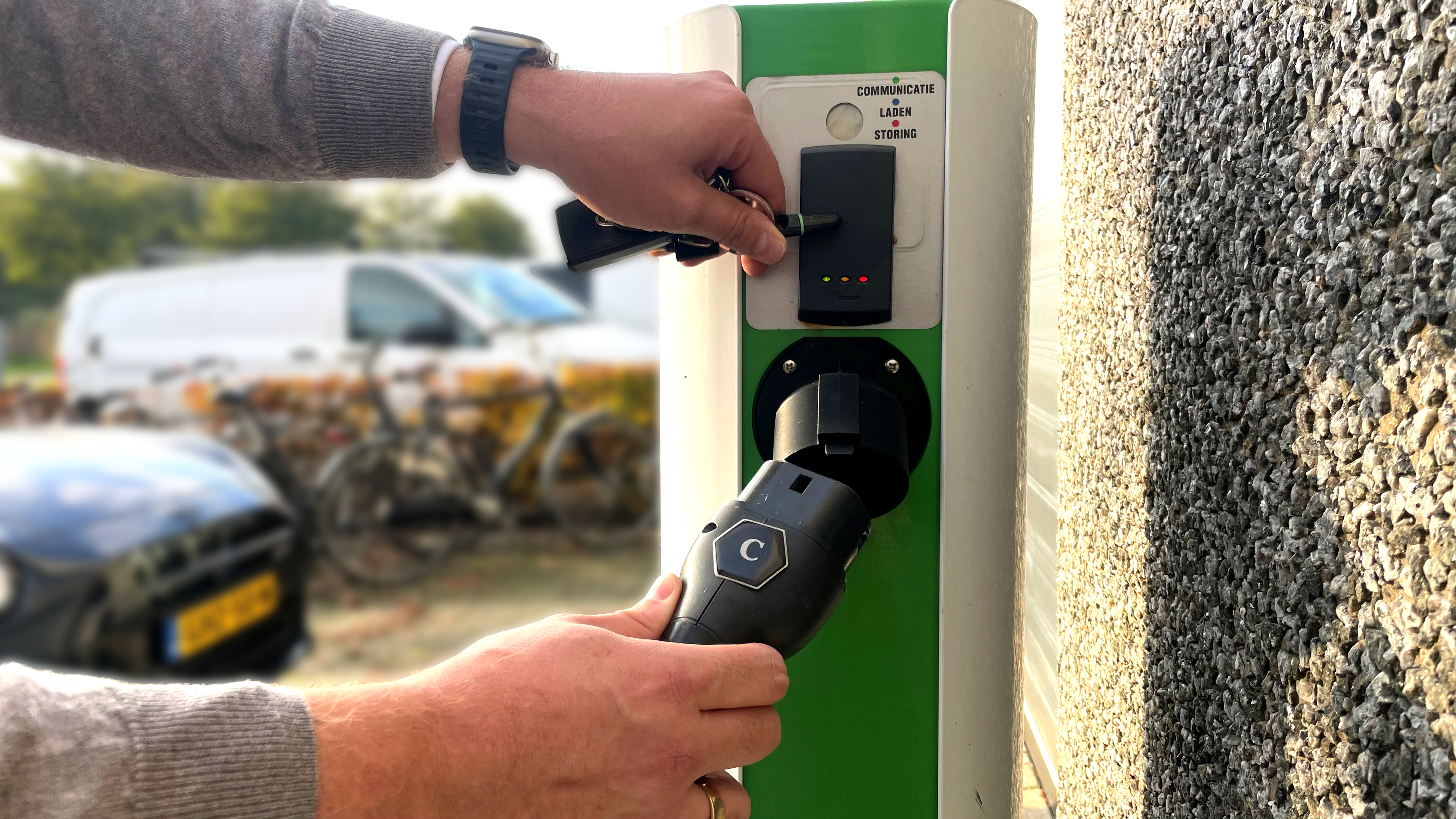 Als het laadpunt geïntegreerd is met de Paxton toegangscontrole systeem, kan je heel eenvoudig je toegangspas of tag aanbieden aan de lezer op de laadpaal. Dan kan het laadpunt gebruikt worden om je elektrische auto op te laden. Biedt je je pas of tag nogmaals aan, stopt het laadpunt met het laden van de auto. Ook als de auto compleet opgeladen is, stopt het laadpunt uit zichzelf met laden.