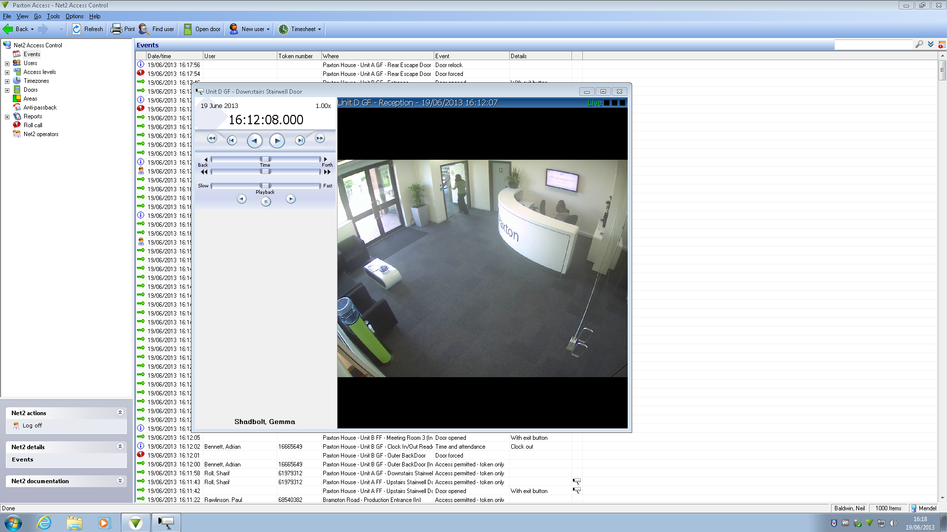Wanneer de gebruiker op het camera icoon klikt zal de Milestone viewer automatisch geopend worden met het bijbehorende camerabeeld, de gebruiker heeft ook toegang tot afspeel opties om de beelden voor- of achteruit af te spelen of te pauzeren. Indien er pasfoto’s zijn toegevoegd aan een gebruiker in de Net2 software zullen die ook getoond worden in de Milestone viewer, zo kunt u in één oogopslag zien of de toegangscontrole gebeurtenissen matchen met de videobeelden. Er kunnen meerdere camera’s geselecteerd worden in de Milestone viewer.