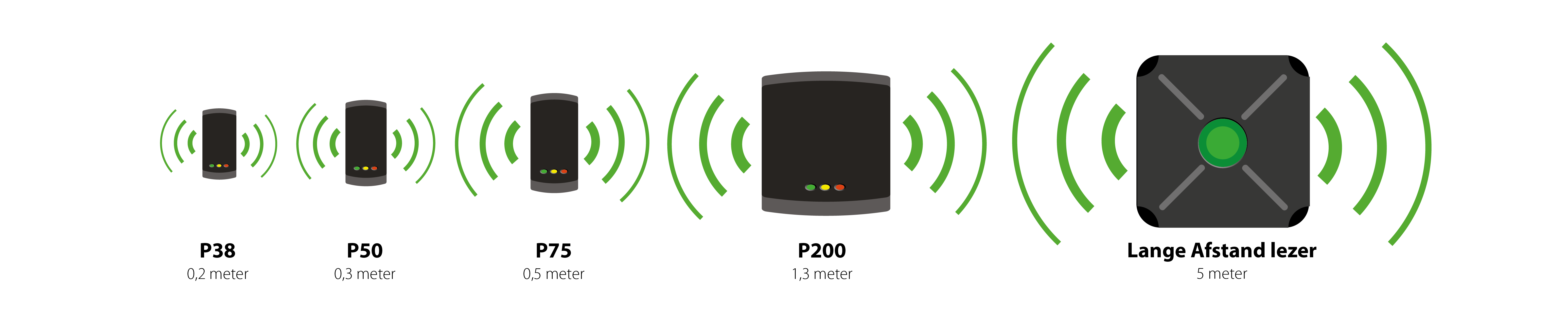 Hieronder vindt u een schema met de verwachte leesafstanden van een lezer en handsfree interface.
