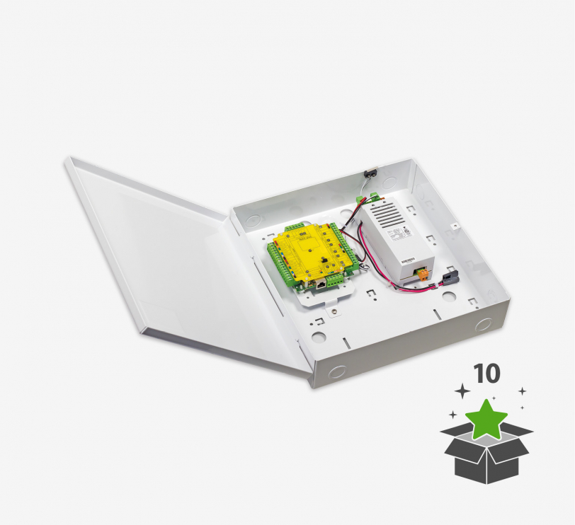 Control units are sold as a PCB only, within a plastic housing or mounted within a 2A boxed metal/plastic mains monitored backup power supply. The Net2 plus unit now comes with PoE+ power supply in metal/plastic cabinet; no separate mains supply back-up required.